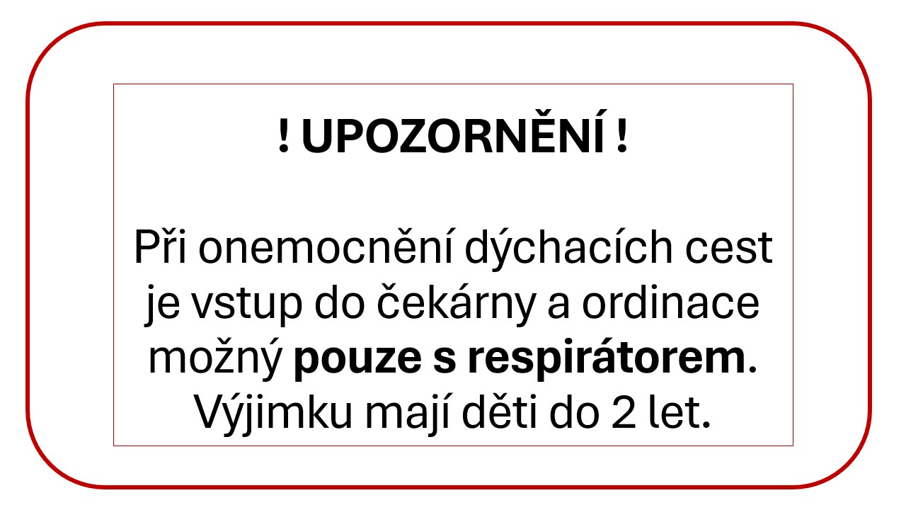 Poslední akutně nemocný pacient se objednává 30minut před koncem ordinační doby vyhrazené pro nemocné pacienty, tj. do 9:30h, ve čtvrtek do 13:30.